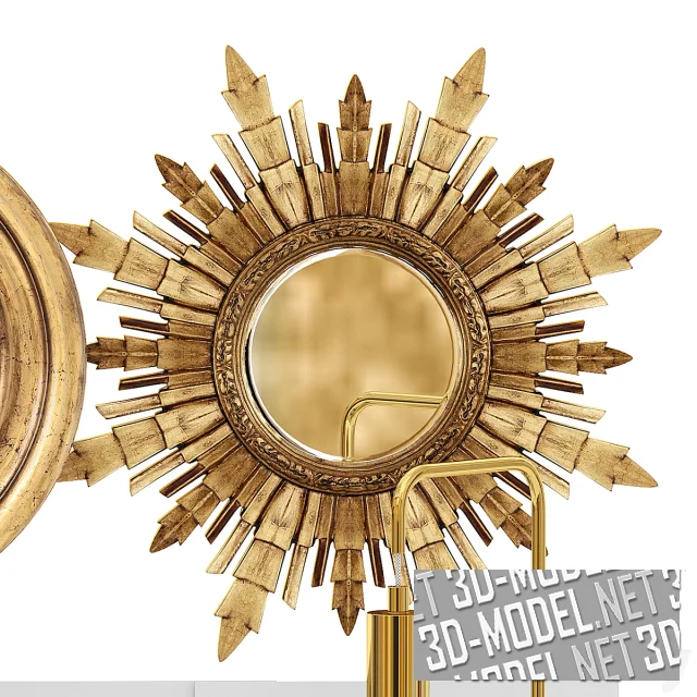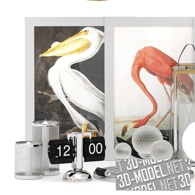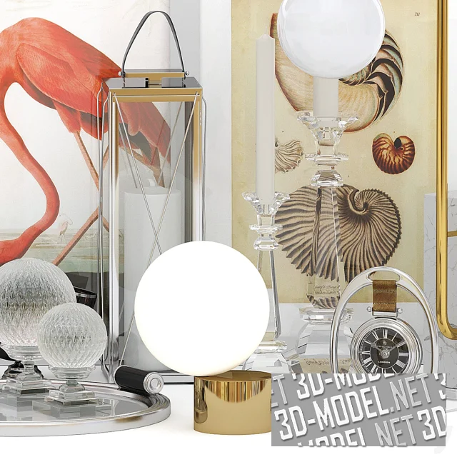 Современный интерьерный декор в наборе от Eichholtz. В наборе: два декоративных круглых зеркала в золотистых рамах (с багетным профилем и в виде стилизованного Солнца), настольный светильник с тонкой гнутой стойкой из золотистого металла на подставке из куска белого с серым мрамора, настольный светильник с белым шариком плафона назолотистом цилиндре подставки, три картины (пеликан, фламинго, морские раковины) в белых рамках, круглый поднос с хрустальными шарами на подставках, настольный стильный календарь, настольные часики, подсвечники нескольких видов.