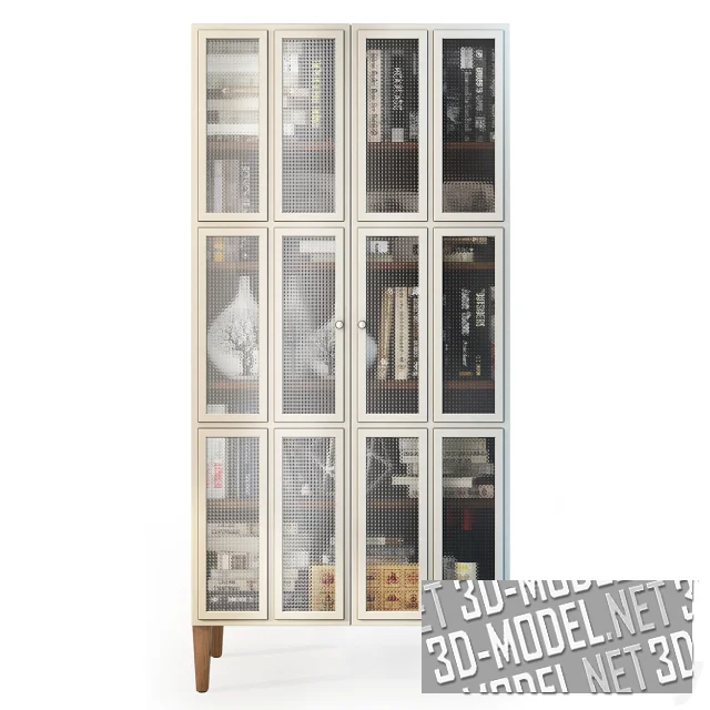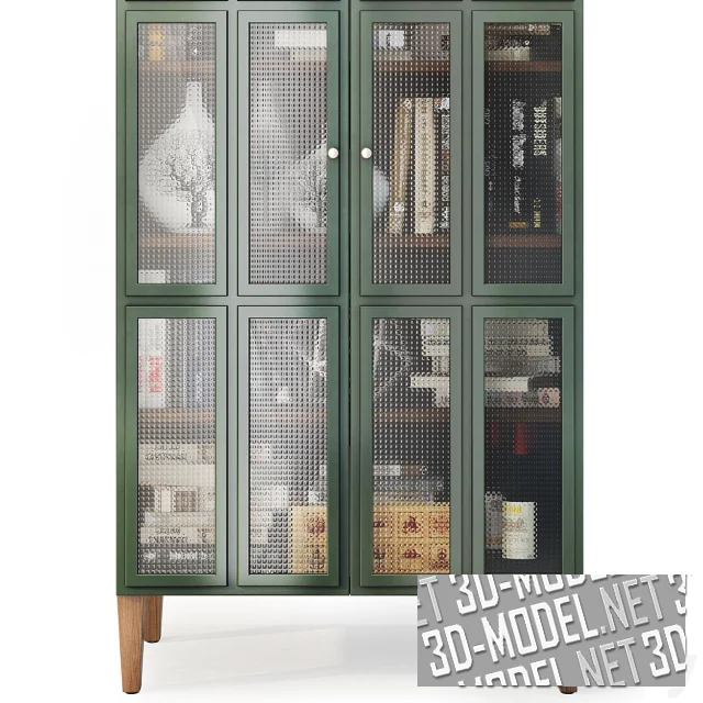 Современный шкаф-витрина (книжный шкаф) в нео-классическом стиле - Andersen от Etg-Home. Плоскости двух створок разделены на шесть небольших рамок с заполнением из рельефного стекла с мелким паттерном из квадратов в рядах. Деревянный корпус и невысокие ножки шкафа - с текстурой дерева светло-коричневого тона. Рамки фасадов представлены в двух цветах: винтажном белом и темно-оливковом. Габарит шкафа: 90х40х190см. На полках размещены: книги, керамика, бутылки с вином, коробка.