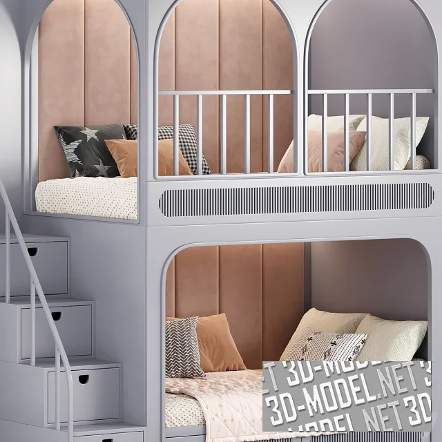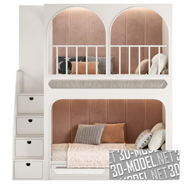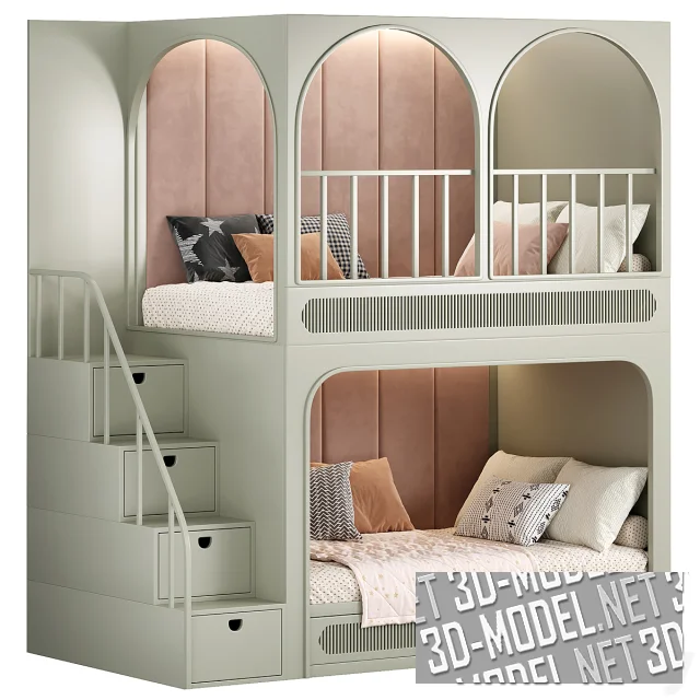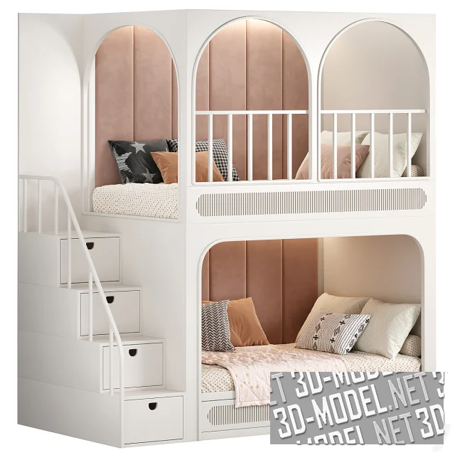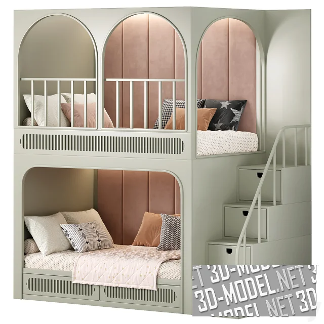 Учитывая каждую деталь, от стартовой идеи дизайна до последнего винтика на полке, бренд предлагает множество интересных решений, среди которых эта детализированная 3D-модель двухуровневой кровати. Три варианта отделки позволяют красиво оттенить или спрятать конструкцию в интерьере комнаты. Мебель отличается высокой функциональностью (все пространство грамотно сформировано таким образом, чтобы ребенку было удобно играть, отдыхать и хранить вещи и игрушки). За безопасное использование отвечает мягкая внутренняя отделка на двух ярусах, скругленные элементы, правильно расставленные ограждения и пр.