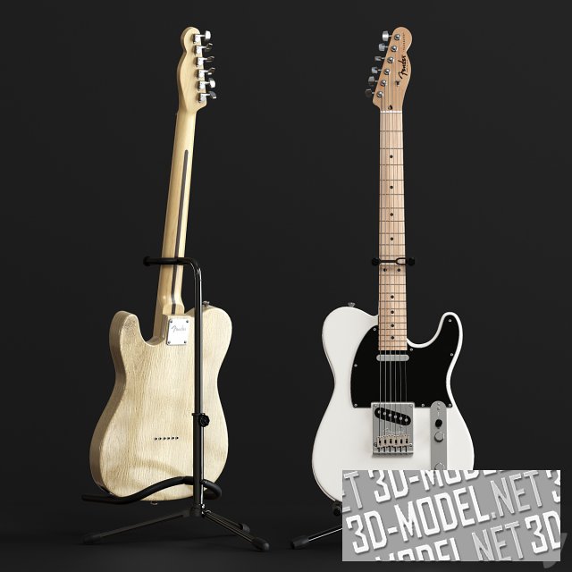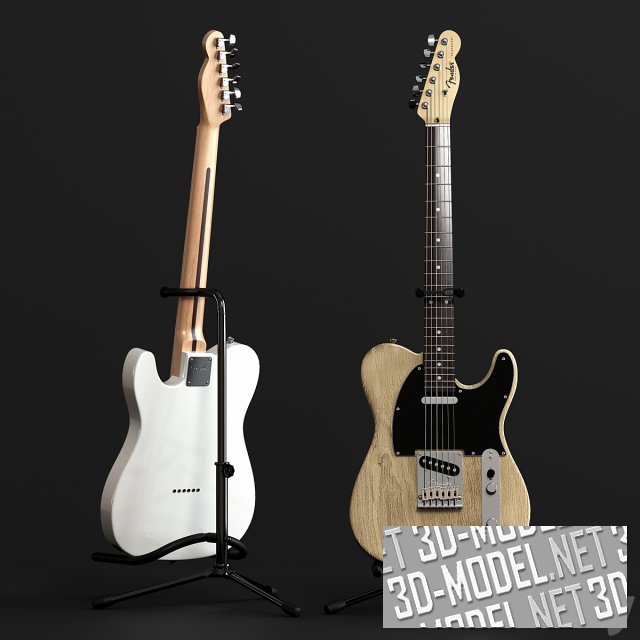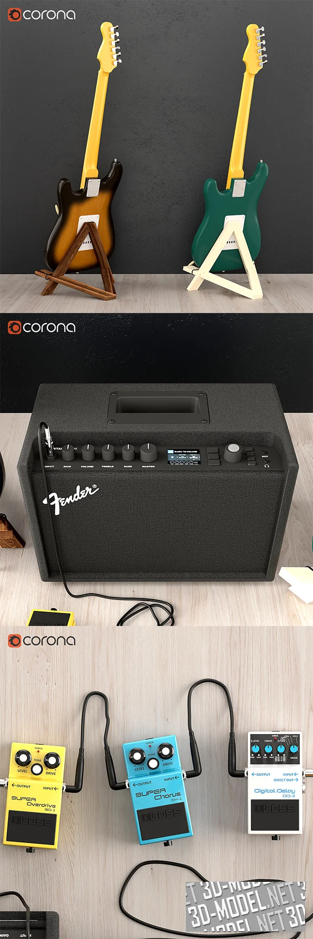 Современный музыкальный комплект инструментов и периферийного оборудования для дома или студии. В комплекте: две электрогитары (с растяжкой от черного к желтому полупрозрачному лаку - Fender Stratocaster 50s 2-Color Sunburst и изумрудно-зеленый - Fender Stratocaster 50s Sherwood Green Metallic), черный комбик Fender Mustang GT 40, педали эффектов (BOSS SD-1, BOSS CH-1, BOSS DD-3), кабели, напольные подставки для гитар и настенные подвесы.