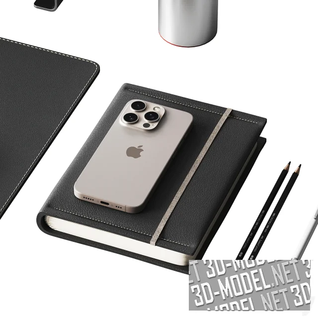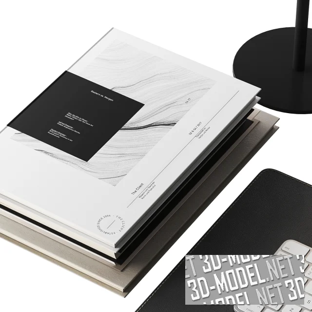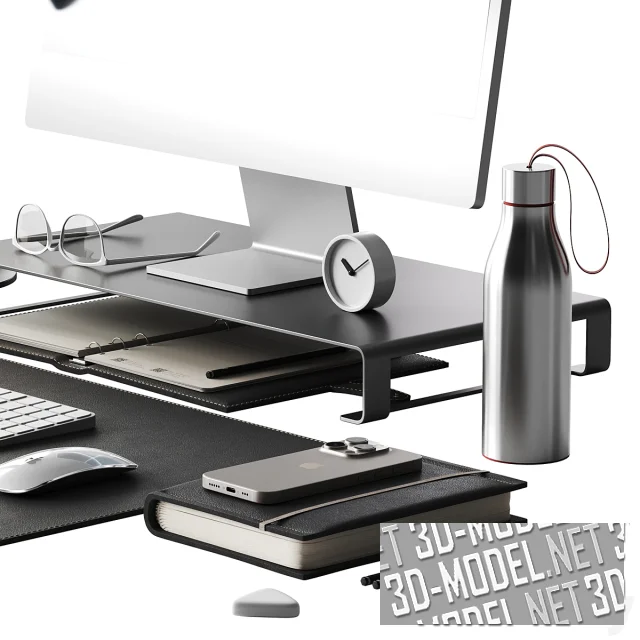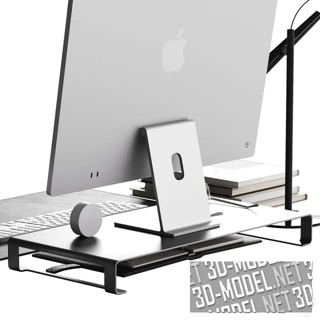 Набор современных аксессуаров для рабочего места с гаджетами от Apple. В комплекте минималистичная настольная лампа черного цвета - Foscarini MAGNETO, кожаный черный коврик, книги, органайзеры в кожаных обложках, бутылочка из серебристого металла, подставка под монитор, очки в белой оправе, ручки, карандаши, ластик.