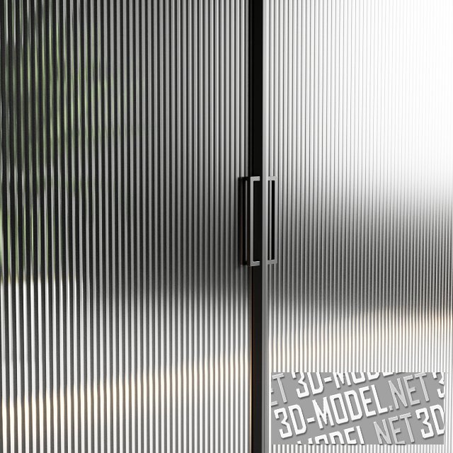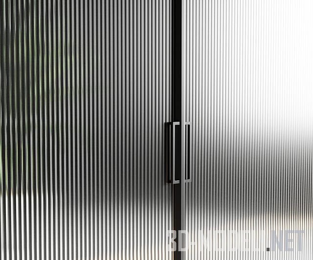 Два варианта современных дверей от Garofoli - распашные из дерева и раздвижные в металлическом профиле, с заполнением из рельефного тонированного стекла. В раздвижных Пространство стены вокруг деревянной двери отделано горизонтальными панелями из того же, что и дверь материала. Высота проемов - 3м.