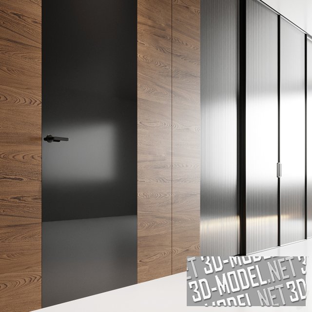 Сет интерьерных дверей-перегородок от Garofoli. Предлагаются в различных вариантах отделки, со стеклом и деревом, что создает любые стилистические возможности зонирования и декора. Фурнитура черного цвета, идеально сочетается с любым видом отделки дверей.