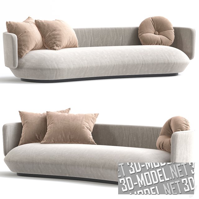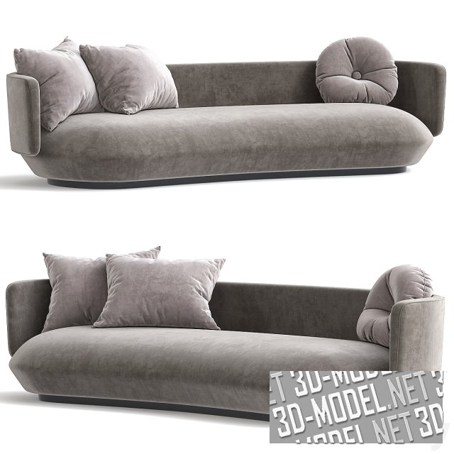 Современный диван Baixo от Guilherme Wentz. Отсутствие видимых швов, крупный цельный элемент подушки сиденья на невысокой базе с черным цоколем, огибающая корпус низкая спинка, переходящая в подлокотники и мышиная велюровая обивка дивана создают минималистичный эргономичный объект для современной гостиной. Пара мягких квадратных подушек и круглая декоративная подушка с крупной пуговкой-втяжкой по центру, лежащие на диване - в чехлах из такой же ткани, что и обивка, но на пол-тона светлее.