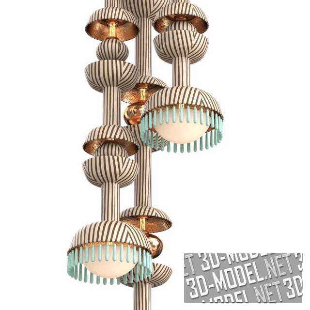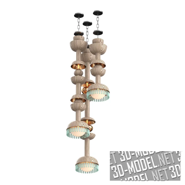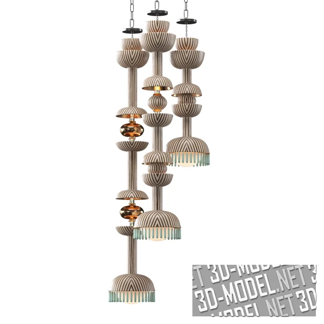 Jeremy Anderson). Три отдельных светильника в группе набраны из идентичных керамических элементов (светло-бежевых, в коричневую полоску) в разной конфигурации. Нижние «чаши» с плафонами по периметру декорированы каплевидными подвесками из бирюзы. Внутренние плоскости плафонов отделаны золотистым металлом с молотковым эффектом. В ось интегрировано несколько ретро-ламп, создающих интересные свето-теневые эффекты.