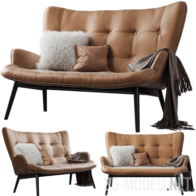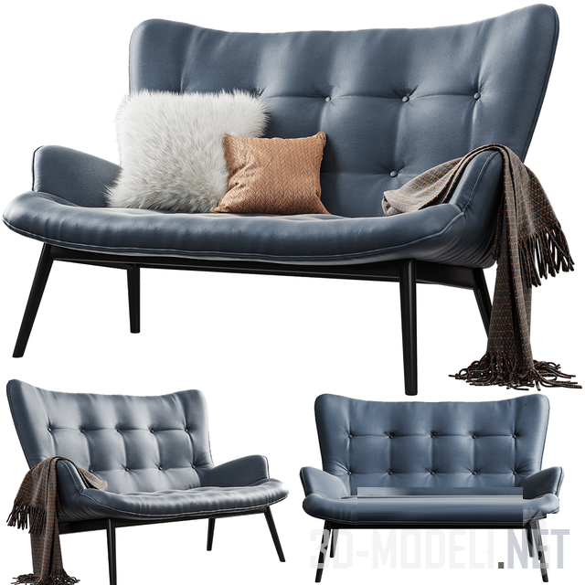 Диван предлагается в нескольких цветовых решениях (синий, коричневый, черный), материал отделки очень приятен на ощупь. Также диван отличает индивидуально разработанная ретро-форма и изогнутые подлокотники. Размеры дивана: