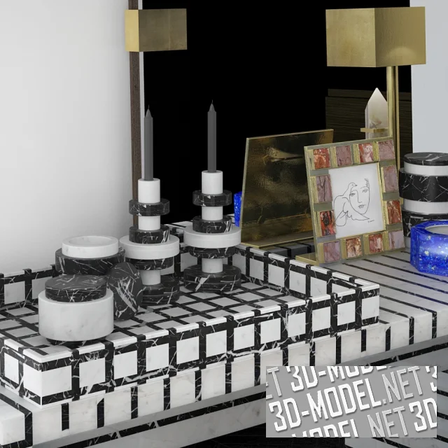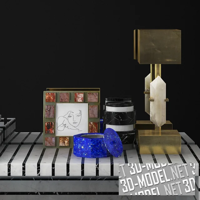 Прямоугольный поднос GRAPHIC TRAY, несколько подсвечников MELANGE CANDLESTICKS и круглые шкатулки MELANGE JAR изготовлены из комбинированного мрамора, наполняют поверхность стола. Дополняет композицию латунная фоторамка CURATED GEMSTONE FRAME, декорированная каменными квадратами. Ярким синим акцентом на столе выступает круглая шкатулка из синего лазурита (LARGE LAPIS BOX).