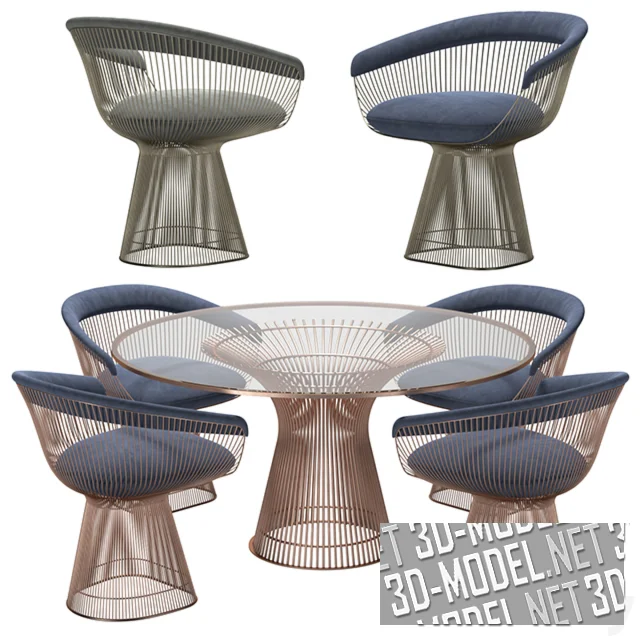 Элегантный комплект обеденной мебели Platner от Knoll, отличный выбор для интерьера современной кухни, кафе, ресторана. В наборе круглый стол (d136,5/h68,58см) и скругленный стул (67,31х55,88х73см). Основа изготовлена в виде металлических моноопор из вертикальных гнутых прутьев, создающих плоскости в виде частой решетки.