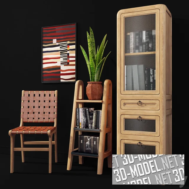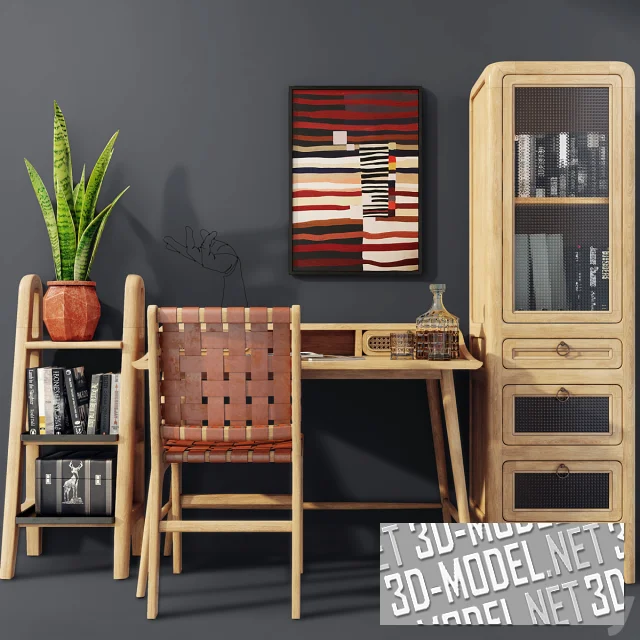 Набор деревянной мебели для домашнего кабинета. Состоит из шкафа, стеллажа, стула и стола Nalu от La Forma. Комплект дополнен декоративными аксессуарами (картина, комнатное растение, книги, журналы). Размеры стола: ширина 110, глубина 60, высота 87 см. Такой комплект станет гармоничной составляющей офиса в домашних условиях в различных стилях (скандинавский, ретро, эко, этнический).