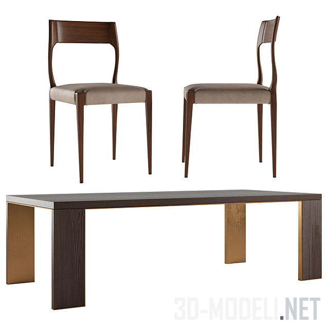 Комплект мебели в столовую Gourmet от LASKASAS. Включает в себя деревянные стулья KAREN, с изящными изгибами спинки и мягким бежевым сиденьем из кожи и прямоугольный обеденный стол с деревянными внешними плоскостями и декоративными металлическими накладками на внутренних плоскостях широких ножек и под столешницей. Дерево на мебели отделано матовым темным лаком.