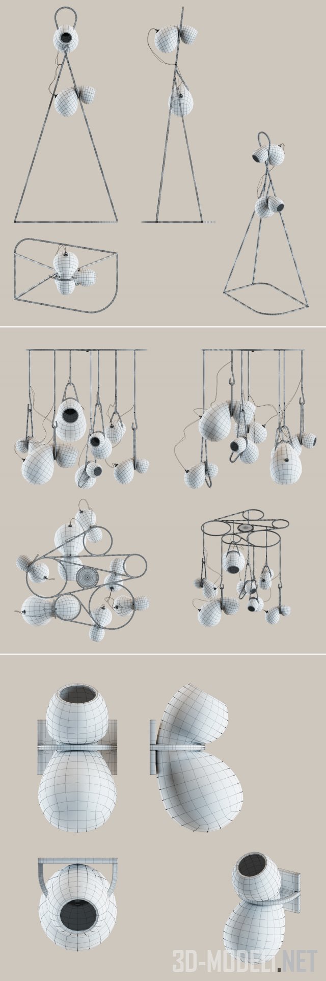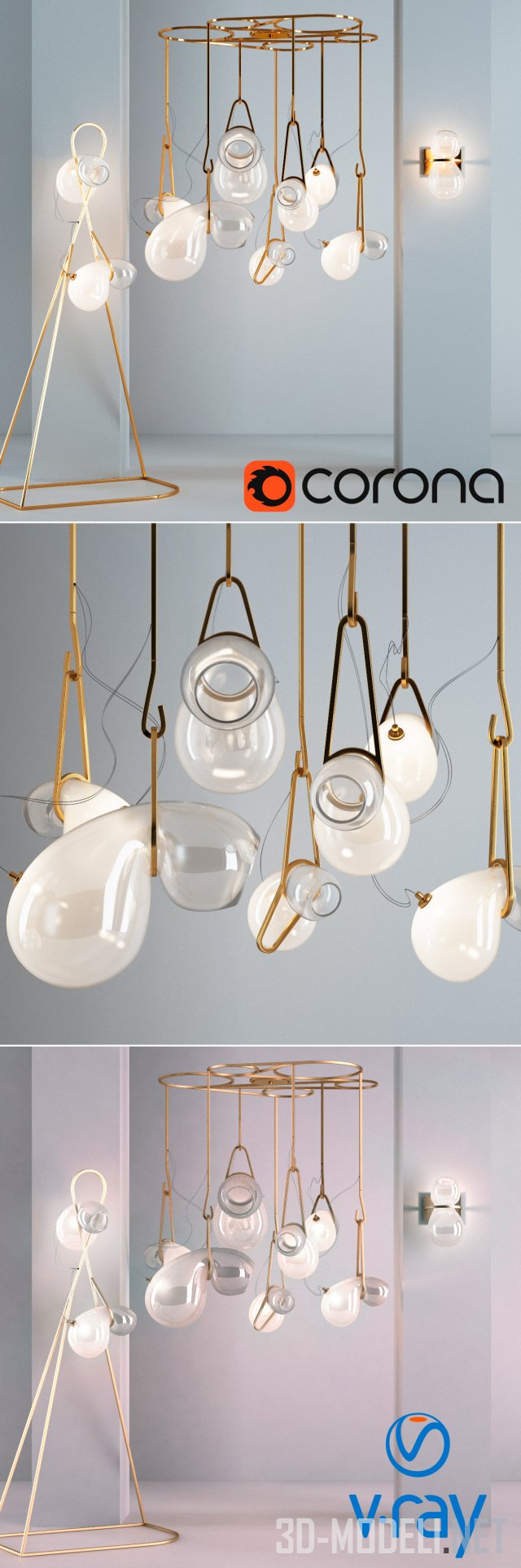 Коллекция авангардных светильников 2015 года CATCH от Lindsey Adelman Studio. В светильниках оригинально скомбинированы тонкие гнутые металлические золотистые элементы каркасов и стеклянные плафоны, изготовленные в виде стеклянных сосудов. В горячем состоянии сосуды «подвесили» в горизонтальном положении, края прогнулись, отчего появился эффект «мягкого стекла». Представлены: бра с одним плафоном, напольный светильник с металлической стойкой и двумя плафонами и люстра на семь ламп.