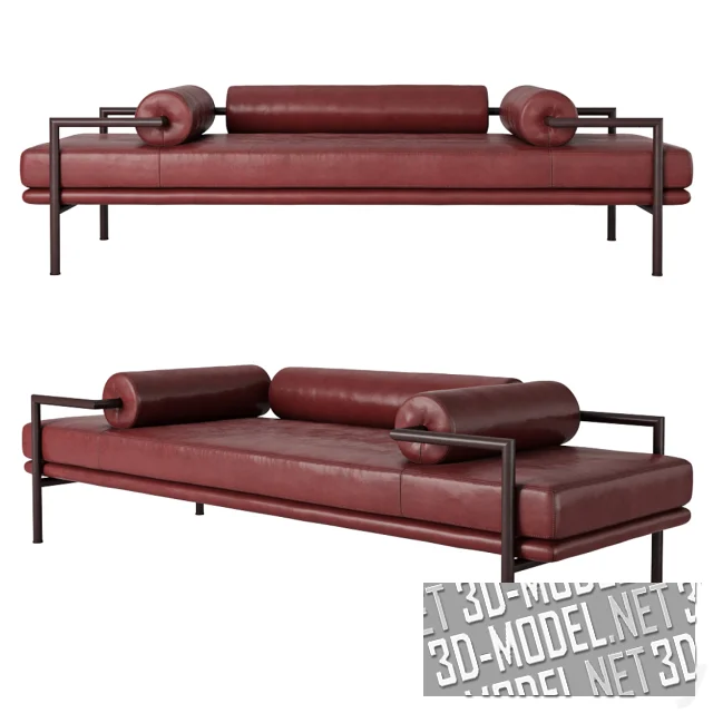 Современная кушетка из металла и кожи - Dorcia от Luteca (дизайнер: JORGE ARTURO IBARRA). Конструкция навеяна архитектурой Luis Barragan. Опоры из темно-коричневой металлической трубы увенчаны двумя крупными мягкими валиками, разделяющими прямоугольное мягкое сиденье дивана на двухместный диван по центру и одинарными сиденьями, развернутыми в стороны, по бокам. На трубу, соединяющую заднюю правую и левую опоры, «нанизан» длинный валик спинки. Габарит кушетки: 82х213х58см. Бордовая кожаная обивка по швам продублирована белой декоративной прострочкой.