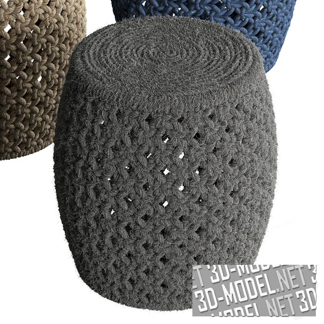 Выполненные в технике макраме бочкообразные пуфики Angela Stool из Madegoods. Сплошная плетеная круглая плоскость и чуть выпуклые боковые поверхности с более редким декоративным плетением создают интересные интерьерные объекты в стиле кантри, прованс, этно. Представлены три варианта толстого шнура, использованного в плетении: натурального джутового цвета (серовато-охристый), лохматый темно-серый шнур и шнур темно-синего цвета с легким глянцем.