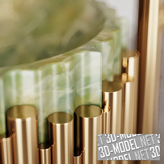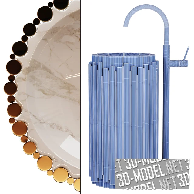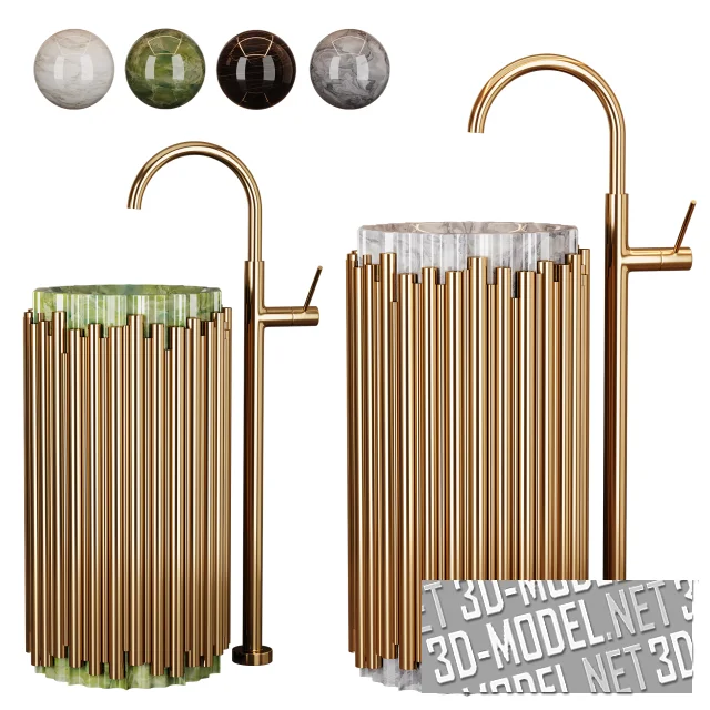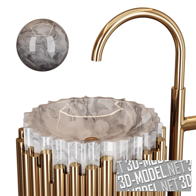 Элегантная композиция для современной ванной с черным мрамором и золотистым металлом, с умывальником Maison Valentina Luxury, бра и зеркалом. Зеркало вертикальное, овальное, в широкой золотистой раме. Отдельностоящий умывальник имеет цилиндрическую опору из черного с тонкими белыми прожилками мрамора, декорированную на две трети высоты вертикальными золотистыми рейками нескольких размеров. Этот декоративный прием отделки дублирован на двух вертикальных бра справа и слева от зеркала. Золотистый смеситель с высоким гусаком, смонтированный на раковине дополняет умывальник. В сцене присутствует пол и высокий профилированный плинтус из черного мрамора с тонкими белыми прожилками.