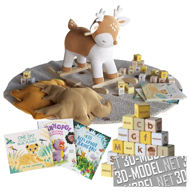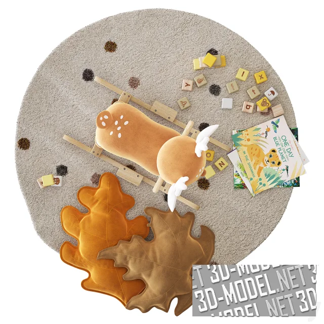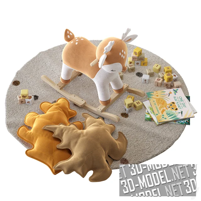 Очаровательный детский игровой набор в теплых осенних тонах объединяет мягкость, уют и образовательные элементы. В центре композиции деревянная бэби-качалка в виде олененка – Mimizan от Maisons du Monde, выполненная в нежных бежево-коричневых оттенках. Она создана для безопасных игр малышей, развивает координацию и чувство равновесия, при этом оставаясь стильным украшением детской комнаты.