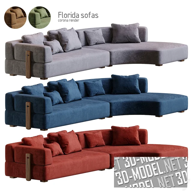 Обивка представлена в нескольких вариантах: светло-коричневая кожа, темно-зеленый текстиль и вариант, сочетающий матовый бежевый с черным. Темно-зеленый диван дополнен светло-серым пледом с бахромой, наброшенным на одну из секций.