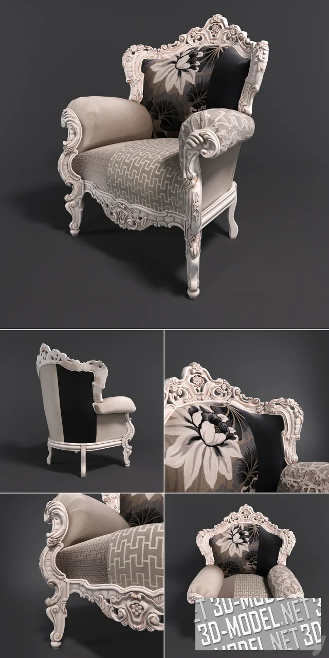Декоративное кресло с резной рамой и обивкой в стиле арт-деко - модель Prince от Modacollection. Габарит кресла: 112х103х92см. Резная барочная рама цвета слоновой кости, с коричневой патиной в углублениях резьбы. Обивка сиденья, фигурной спинки и подлокотников с отворотами - комбинированная, из нескольких видов ткани с различными орнаментами, в сочетании бежевого, черного, белого цветов.