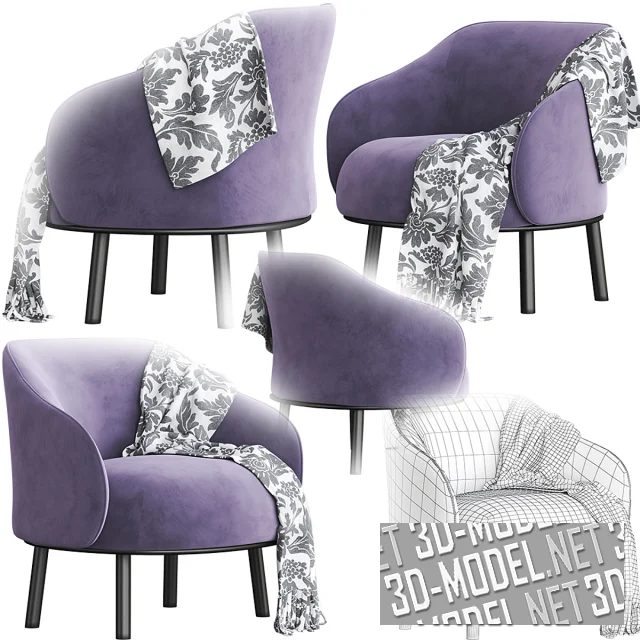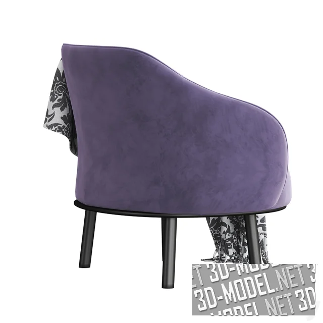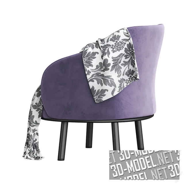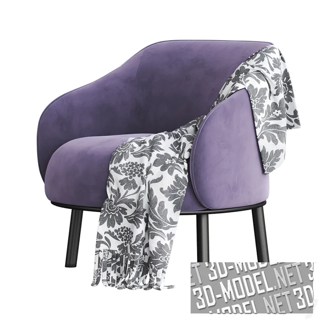 Небольшое кресло Botanic производства Natuzzi. База на четырех невысоких ножках черного цвета. Мягкое сиденье и огибающая спинка, переходящая в закругленные подлокотники, обиты велюром лавандового цвета. Белый плед с черным дамасским орнаментом, небрежно брошенный на кресло, отлично гармонирует с обивкой и черными ножками. Габарит кресла: 82х81,2х79,8см.
