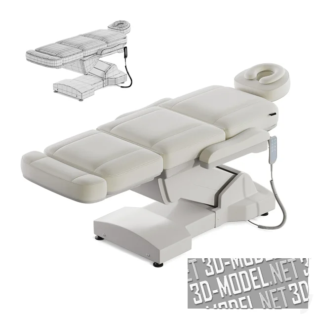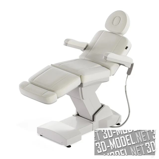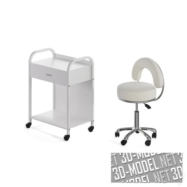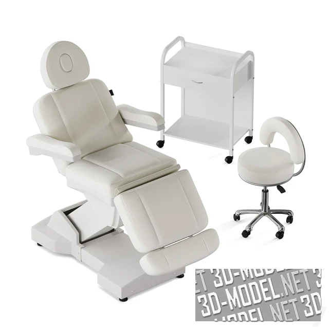 В наборе: мобильное кресло с белой мягкой обивкой и полукруглой спинкой; кольцевая светодиодная лампа на штативе, с креплением для смартфона; мобильная белая тумба с лупой на подвижном кронштейне и расходными материалами для косметологии на полках; трехсекционная белая ширма, с наброшенным белым полотенцем.