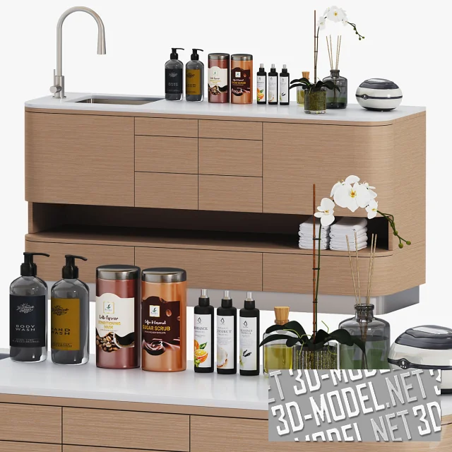Набор современной мебели (KIWI от Nilo spa design, коллекция Green Prestige) с отделкой под дерево бежевого тона, для спа-салона Ninfea. В наборе: рабочая стойка с белой столешницей, прямоугольной мойкой, смесителем, выдвижными ящиками, открытой полкой с белыми сложенными полотенцами. На рабочей поверхности: флаконы и емкости со средствами по уходу за телом, белый фаленопсис, аромо-диффузор с палочками, овальный настольный стерилизатор для маникюрного инструментария.