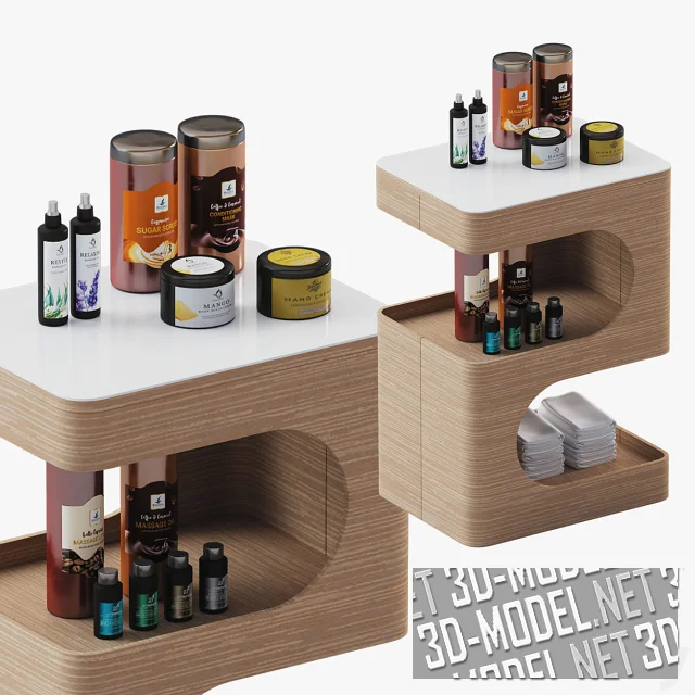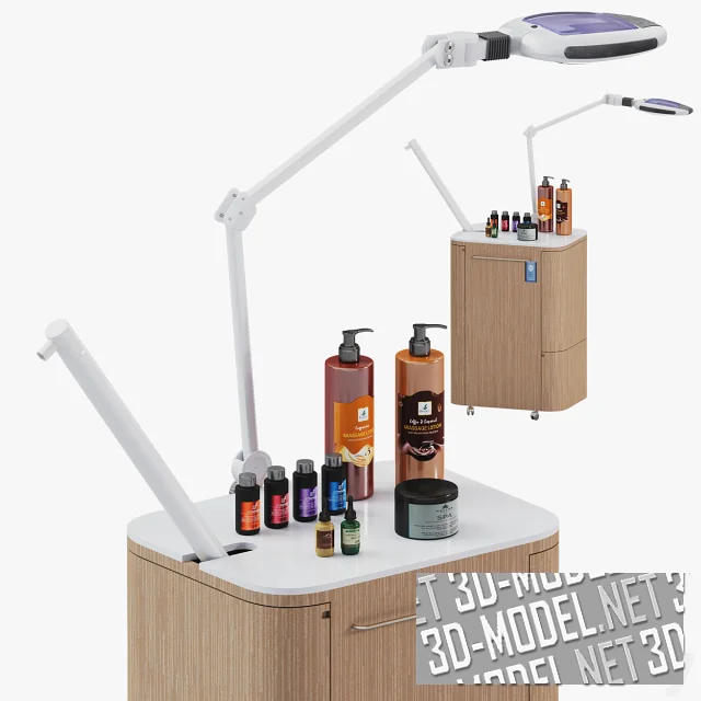 Кроме этого в наборе тумба ACACIA со скругленными вырезами и двумя полками, заполненными свернутыми белыми салфетками, косметическими средствами и средствами по уходу за телом, передвижная тележка с тумбой VAPO BEAUTY JOY, со встроенным отпаривателем и системой выдвижения на небольших роликах. К тумбе тележки прикреплен профессиональный светильник LUX на белой коленчатой штанге. Присутствует косметологическое кресло TIMO на роликах, с регулировкой высоты мягкого сиденья, обитого меланжевым бежевым текстилем.