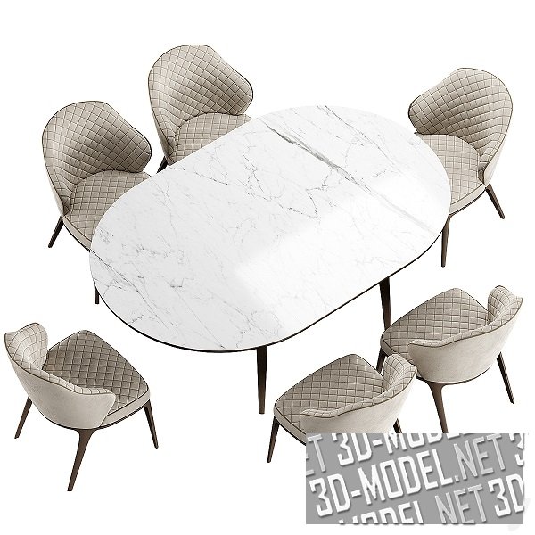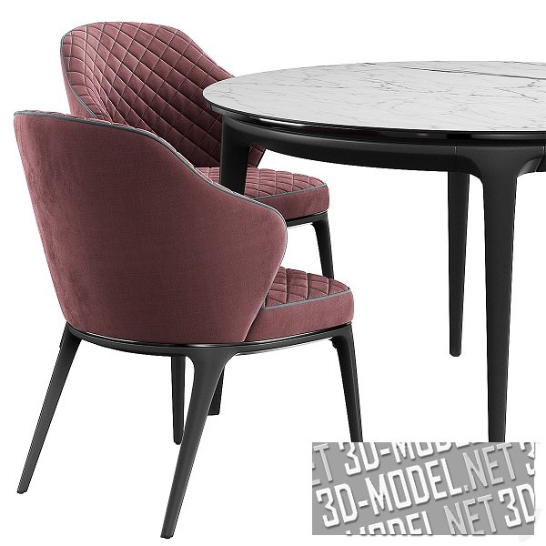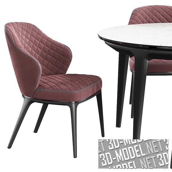 Комплект обеденной мебели (стол Play от Performa и стулья Dean Konyshev) в двух вариантах. Представлены столы в собранном положении (d125см) и в раздвинутом состоянии с прямоугольной вставкой посредине столешницы из белого мрамора с черными тонкими прожилками. Ножки стола изготовлены из массива ясеня и тонированы в черный цвет. Подложка под тонкой столешницей тоже черная. Полукресло с двумя вариантами мягкой обивки: белой и грязно-розовой. Верхняя плоскость мягкого сиденья и внутренняя плоскость огибающей спинки прострочены ромбовидной клеткой. В шов между деталями обивки интегрирован серый (на грязно-розовой обивке) или коричневатый (на белой) шнур. Ножки стульев - черные и бронзово-коричневые соответственно. Габариты полукресла: 60,5х63,5х82см.