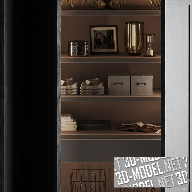 Черный, с текстурой дерева, трехсекционный гардеробный шкаф Verona от Pianca, с шестью створками. Створки двух секций приоткрыты. За ними просматривается наполнение: женская одежда на вешалках, фоторамки с постерами, коробки, прямоугольные корзинки из проволоки, подушки, сложенные сорочки, настольное круглое зеркало на подставке, песочные часы, книги и стеклянная ваза. Габарит шкафа: 424х62,4х257,7см. Деревянные фасады с рамкой из того же материала и имеют перемычку, отделяющую верхнюю четверть плоскости фасада.