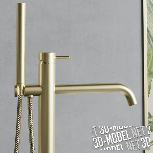 В комплекте напольный смеситель в отделке матовое золото, с душем для ванны (производитель: Quadro Design). Высота смесителя 1117 мм.