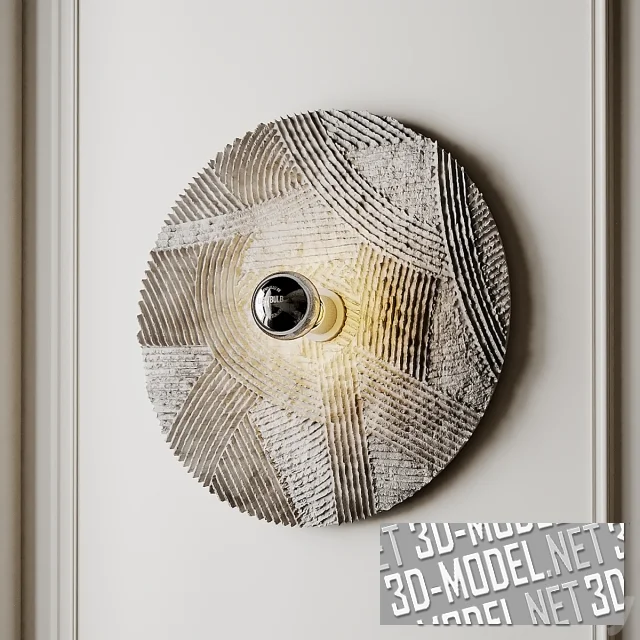 Круглый современный настенный светильник SOLCO от RADAR INTERIOR с крупным (d60см) рельефным рефлектором из каррарского мрамора. Рельеф нанесен на лицевую поверхность мраморного круга в виде групп бороздок с разным направлением, напоминающих канавки от зубчатого шпателя для наклеивания плитки. Лампа с зеркальной реверсивной колбой размещена в центре круга, в белом патроне.