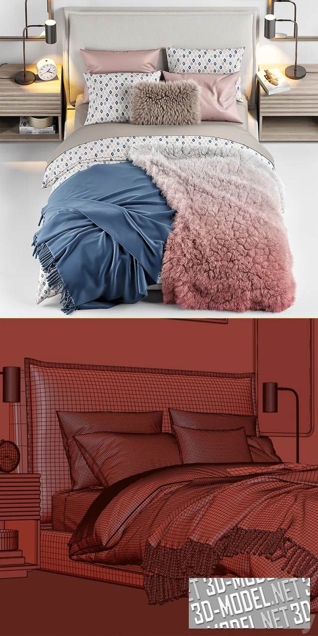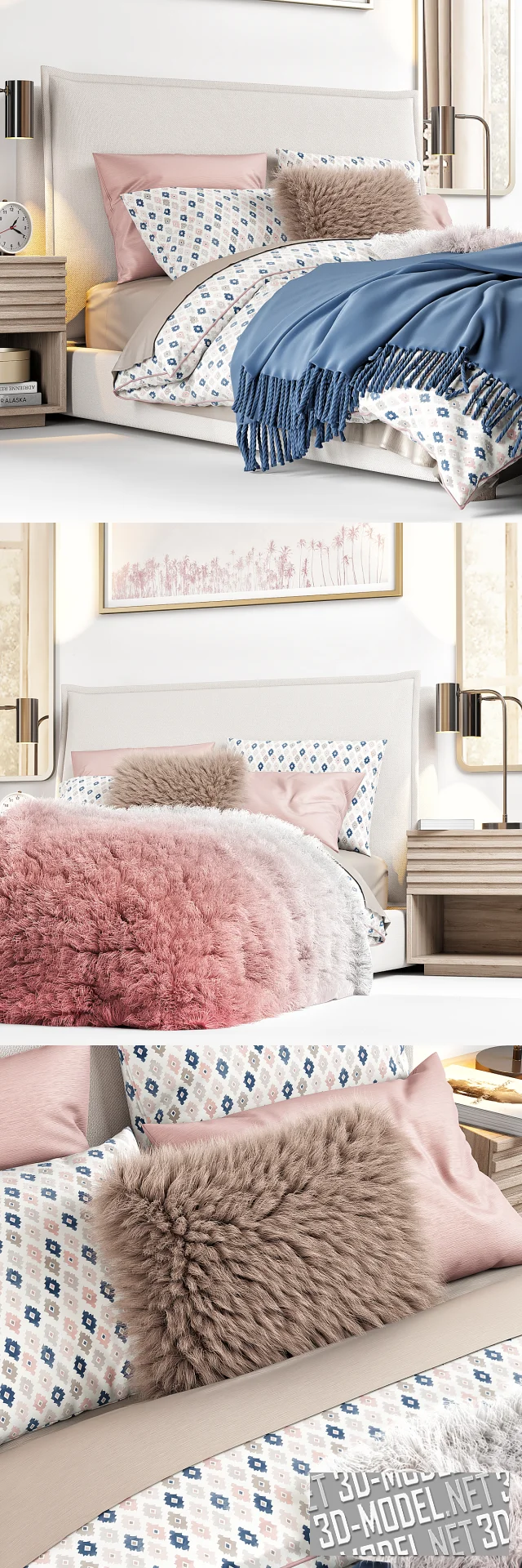 Наполнение современной спальни с кроватью SLOANE от Restoration Hardware. Кровать с высоким мягким изголовьем светло-песочных тонов застелена пестрым постельным бельем, дополнено одеялом из длинношерстного искусственного меха цвета розового «деграде», и синим пледом. Одна из декоративных подушек убрана в чехол из искусственного меха цвета какао.