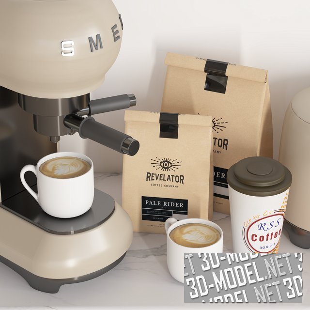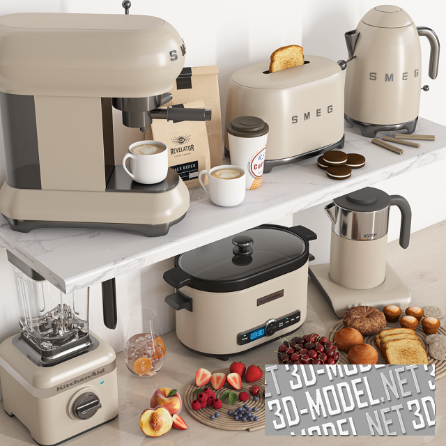 Большой набор кухонных принадлежностей, посуды и кухонной бытовой техники от SMEG в бежево-золотистом сочетании. Элементы распределены в трех ярусах, на полках и столе. Светло-серые керамические чашки развешаны на золотистой рейлинговой системе. Из бытовой техники SMEG в наборе кофемашина, тостер, кофемолка, электрочайник, миксер, кофеварка. Вся техника выполнена в одном стиле, с легкой ноткой винтажа, с бежевыми или белыми корпусами и элементами из золотистого полированного металла.