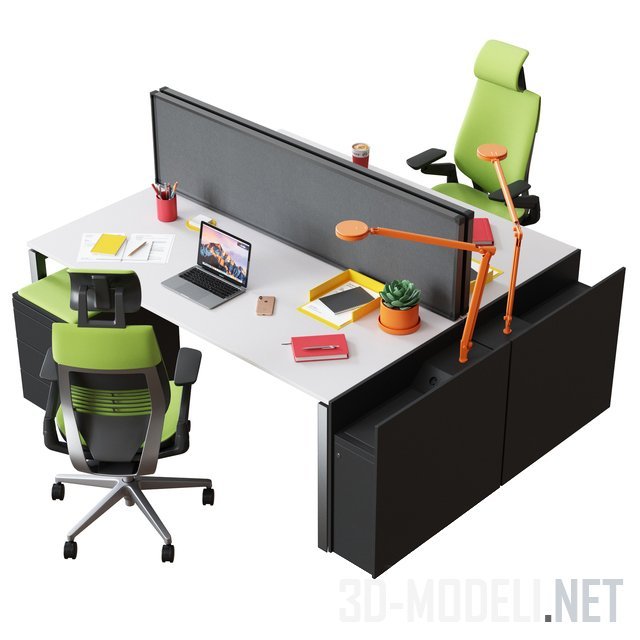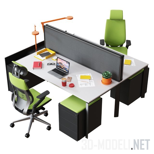 Современное рабочее место от Steelcase и аксессуары. В наборе: письменные офисные столы FrameOne (180х80см), разделенные экраном Partito Screen (46x180см), с креслами Gesture на роликах, настольные светильники на оранжевых кронштейнах, ноутбуки, горшки с суккулентами, холдеры для бумаг. Основное сочетание мебели: графитовый, серебристый, салатовый.