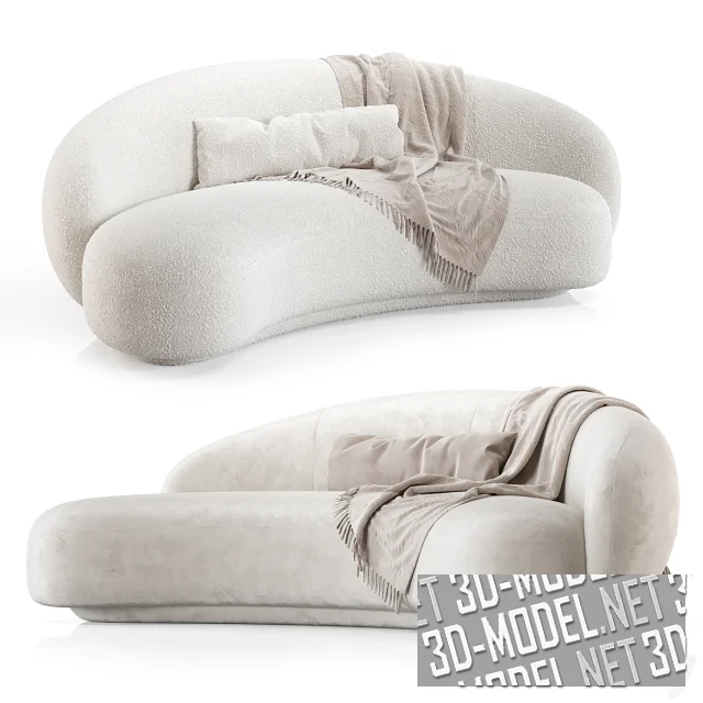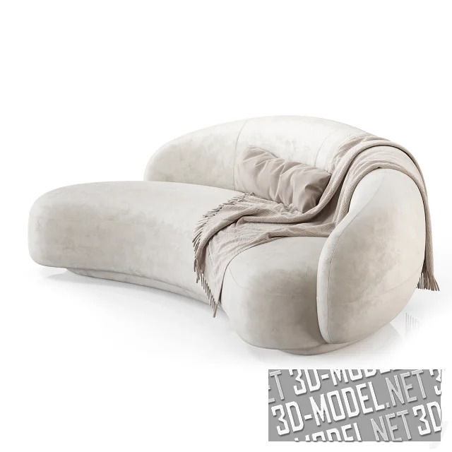 Современный криволинейный, ассиметричный белый диван Julep от Tacchini (дизайнер Jonas Wagell). Габарит дивана: 208х121х75см. Обивка представлена в двух вариантах: белое букле и грязно-белый велюр. Небольшой бледно-бежевый плед с бахромой и узкая горизонтальная подушка дополняют модель.