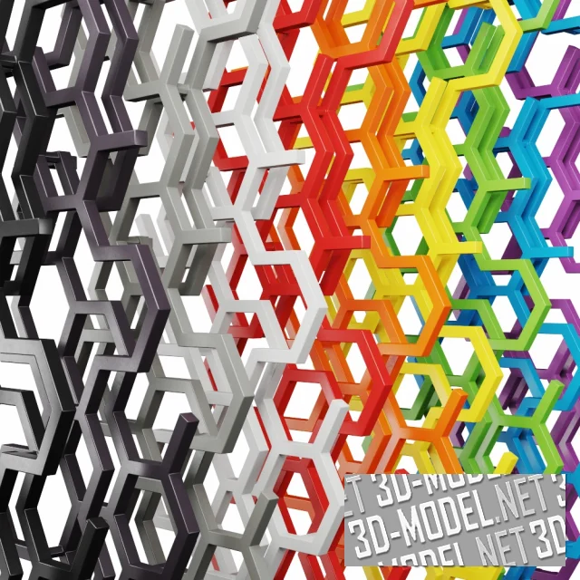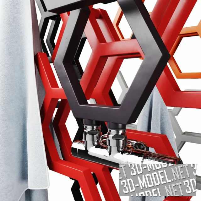 Коллекция современных дизайнерских водяных радиаторов-полотенцесушителей HEX от Terma (награда: Design Award 2017). Радиаторы изготовлены из трубы квадратного сечения в виде групп шестигранных сот в нескольких конфигурациях (габариты: 50,2х112,6см; 170х57,4см; 82,1х48,6см; 122х48,6см; 42,2х71,1см). Хромированный кран терморегулятора установлен в нижней части радиатора. Финишная отделка сот представлена в 10 цветах (черный, темно-коричневый, серый, белый, красный, оранжевый, желтый, салатовый, голубой, фиолетовый). Сцена дополнена полотенцами (3 варианта).