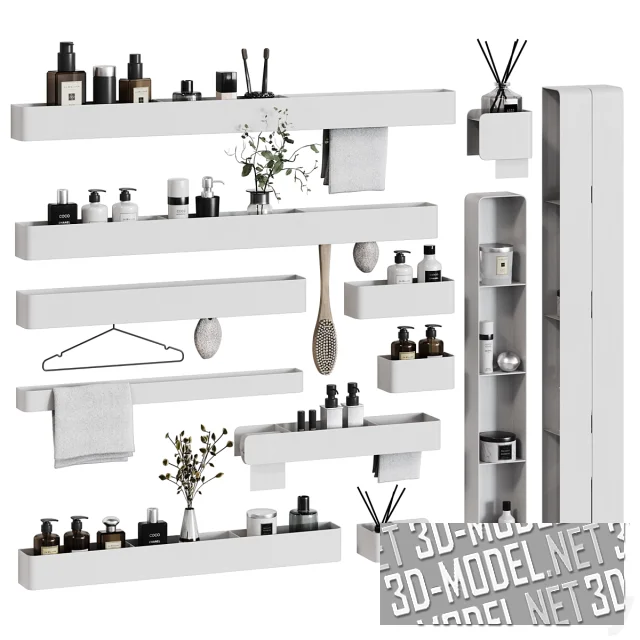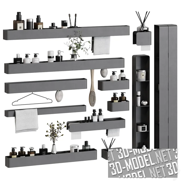 На полках и вешалках размещены белый махровый халат, белые махровые полотенца, плетеная корзина (Blomus TELA- Anthracite - Size M/L), диспенсер (Blomus NEXIO - matt), мыло (Blomus SATOMI- 500/300 мл), аромо-свеча (Blomus VALOA- Size S/L), круглое косметическое зеркало (Blomus MODO - Black), набор сменных ароматизаторов (Blomus FRAGA).