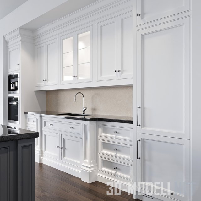 Современная белая кухня в классическом стиле от Tom Howley с островной секцией серого цвета, мойкой, смесителем и встроенной бытовой техникой. Симметричная компоновка основных блоков в нише подчеркивает стиль. Пенал с встроенной техникой, рабочая поверхность с мойкой посредине и навесными секциями, пенал со встроенным холодильником. Соосно с мойкой - варочная поверхность на пятисекционном острове с двумя тумбами по краям. Широкий багетный венец, пилястры и филенки поддерживают стилистику гарнитура. Встроенная техника: комби-пароварка Miele (DGC 6865); кофемашина Miele (CVA 6800). Столешница - черная глянцевая. Ручки на фасадах и смеситель хромированные.