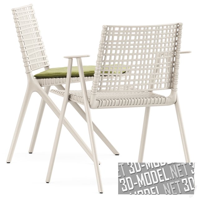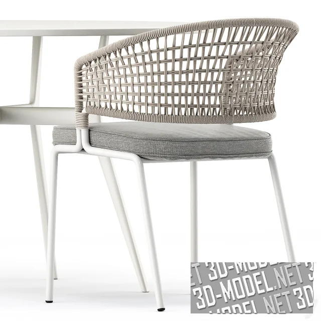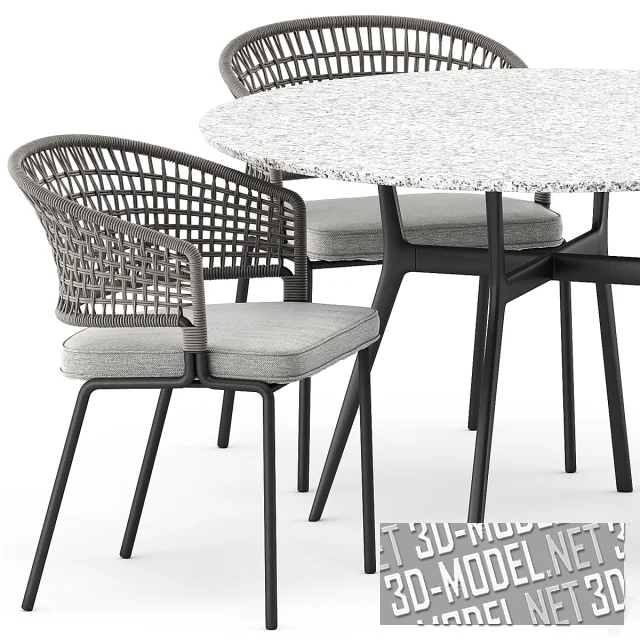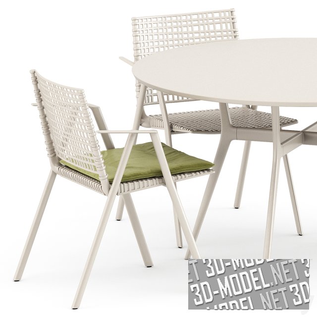 За воздушным, непринужденным внешним видом скрывается сложный дизайн и продуманные материалы: литой алюминиевый каркас с тонкими деталями сочетается с сиденьем и спинкой из полипропилена, армированного стекловолокном и устойчивого к ультрафиолету. Сидеть очень удобно благодаря анатомической упругости спинки. В набор входит стол с базой из дорогостоящего металла и столешницей со специальным покрытием черного цвета (размер стола 125 см x 75 см), кресла (59 см x 57 см x 80 см, 54 см x 57 см x 80). Такой мебельный комплект идеально подходит для использования как в доме, так и на свежем воздухе.