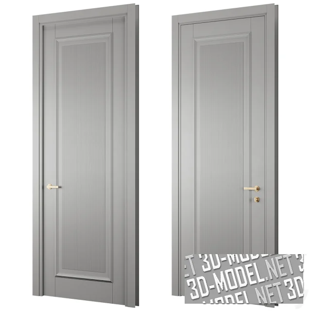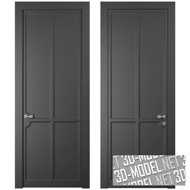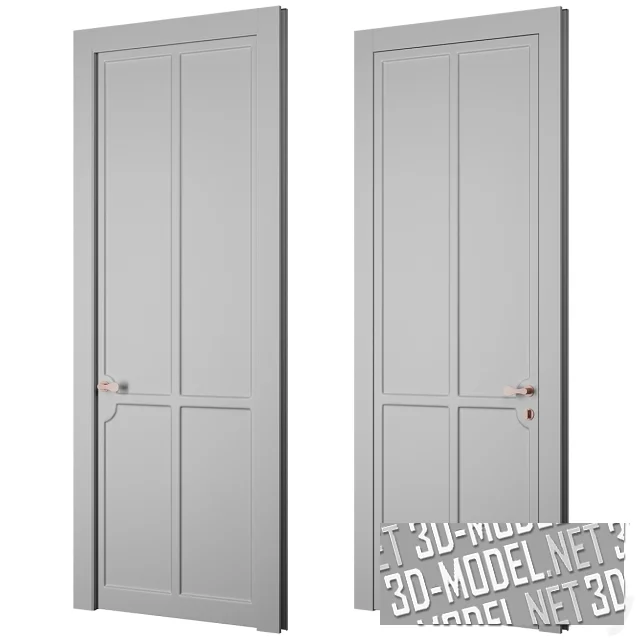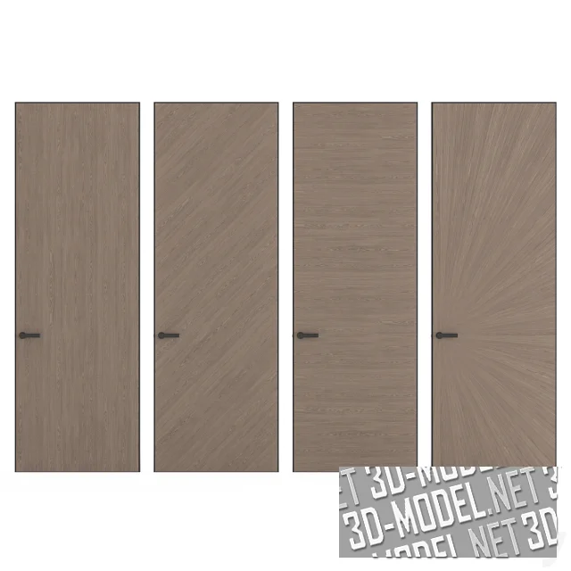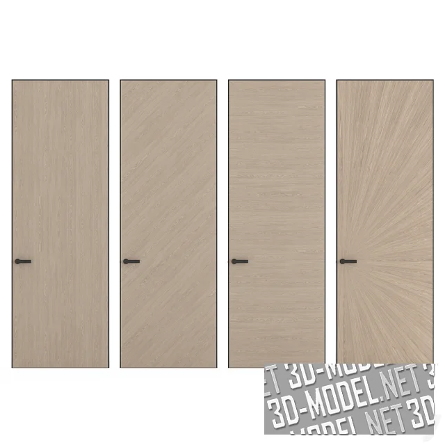 Двери укомплектованы ручками (серебристыми и золотистыми) и коробками с наличниками. Модели в тринадцати материалах и цветах (дерево под лаком, оттенки серого, оливково-серый, белый, слоновая кость, черный).