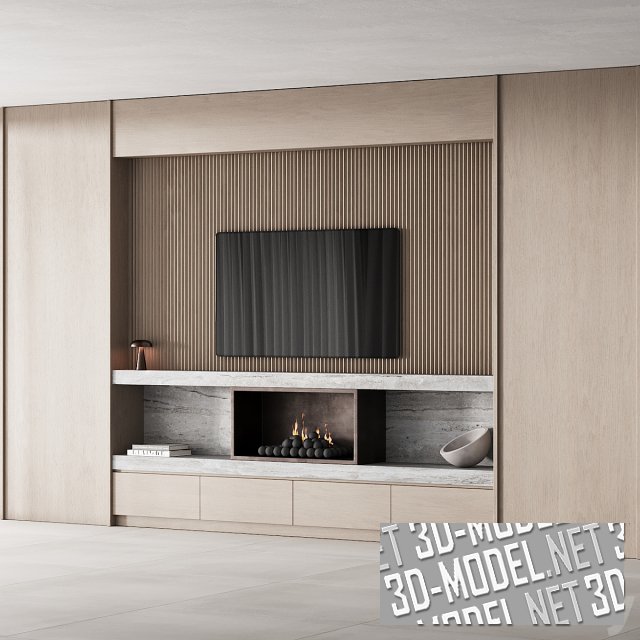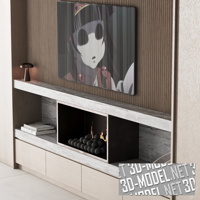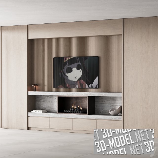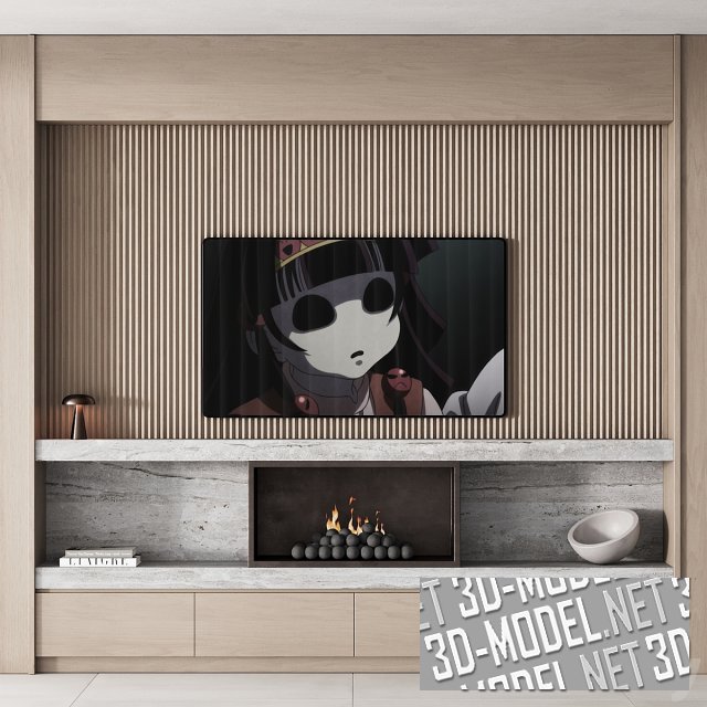 В нише небольшой прямоугольный биокамин с оригинальными углями в виде черных матовых шаров. Справа и слева от камина стопка книг и керамический белый вазон. Большая ниша с ТВ-панелью отделана светлым материалом с вертикальной частой фрезеровкой и невысокой антресолью с глухим фасадом наверху. Небольшой настольный светильник притаился на краю полки. Для поддержки атмосферы на экране ТВ-панели кадр из японского аниме. Габарит группы: 300 х 500 х 42 см.