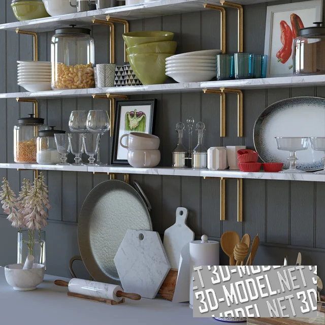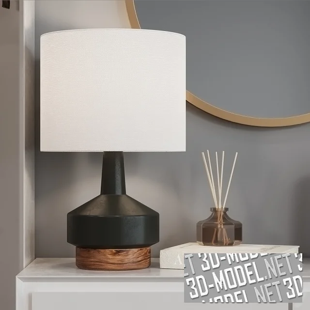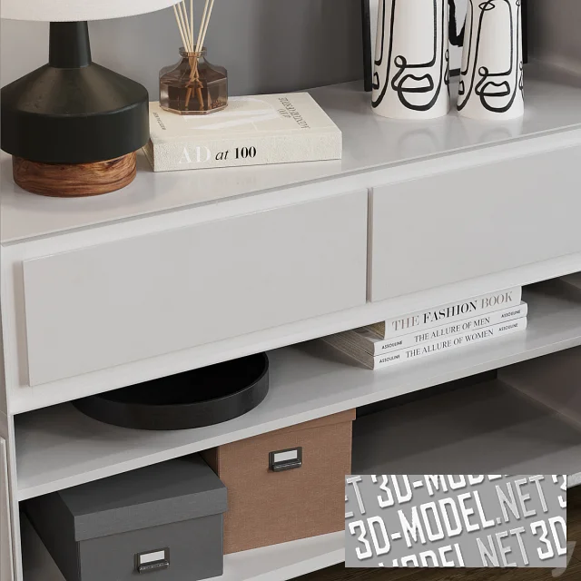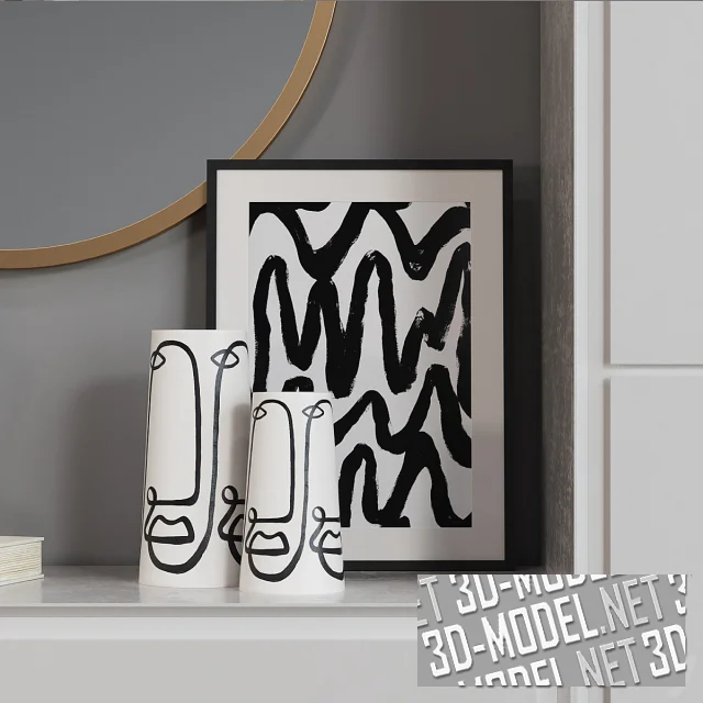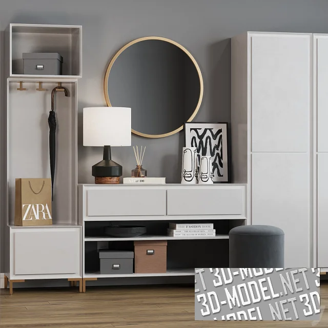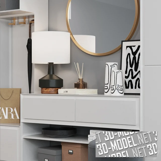 Набор для наполнения прихожей в скандинавском стиле от West Elm. В комплекте белая мебель (пенал с вешалками и тумбой, стол с полками и выдвижными ящиками, двустворчатый платяной шкаф) Nolan Entryway, темно-серый цилиндрический пуф Auburn, круглое настенное зеркало в золотистой раме, настольный светильник Wood Ceramic на черной опоре с белым тканевым абажуром и круглой деревянной подставкой, вазы Franca NYC Cara Pillar Vase со стилизованными черно-белыми лицами, аромо-диффузор, книги, коробки, черно-белая абстрактная картина в черной фоторамке. В пенале с вешалкой - черный зонт и брендированный бумажный пакет ZARA. Габарит композиции: 270х180х40см.