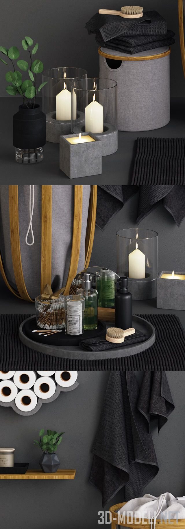 Несколько предметов и аксессуаров для интерьера ванной комнаты. В наборе корзина для белья с подкладкой из ткани (D 45 x H 56 см), оригинальное крепление для туалетной бумаги, складная корзина с каркасом из бамбука (D 30 x H 30 см), светлые маленькие крючки с черными банными полотенцами IKEA Сальвикен, дозатор из метала, емкости из термостойского стекла, несколько белых свечей Eternal Musk, диффузор с ротанговыми палочками, декоративный фонарь с цементным основанием (D 18 x H 25 см) и ваза и подносы из бетона Zakkia (D 50 см, D 30 см, 12 x 33 см).