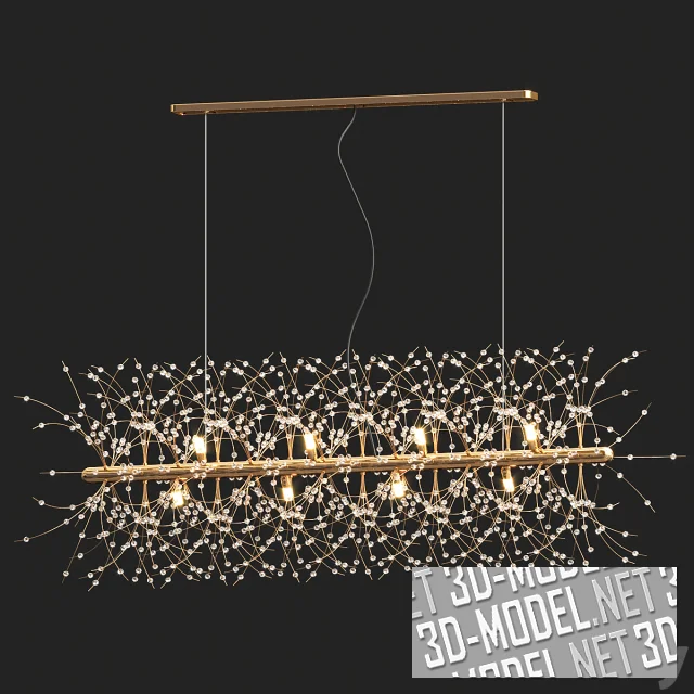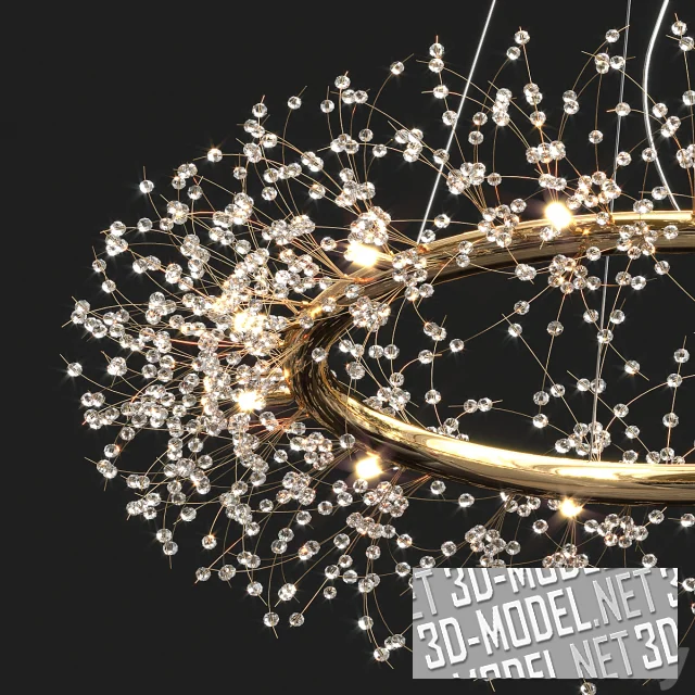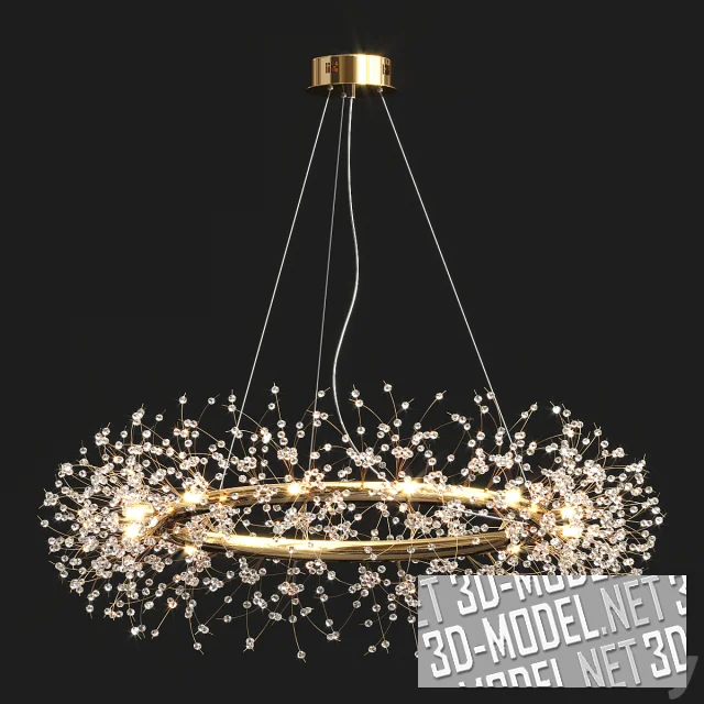 Изящный потолочный светильник Fleur от Z Gallerie, в виде золотистого металлического кольца с множеством тонких золотистых нитей с прозрачными шариками хрустальных кристаллов. Словно венок, усыпанный каплями росы, висящий на тонких тросах обруч подсвечивается несколькими небольшими лампочками, создавая волшебную игру светотени. Диаметр кольца - 101см.