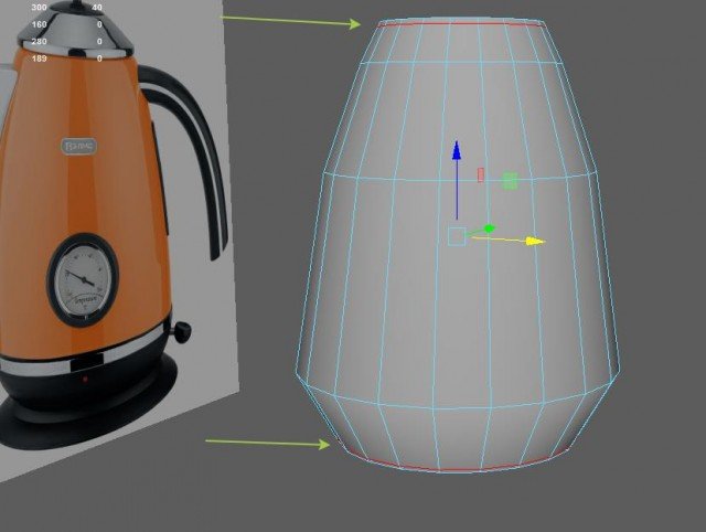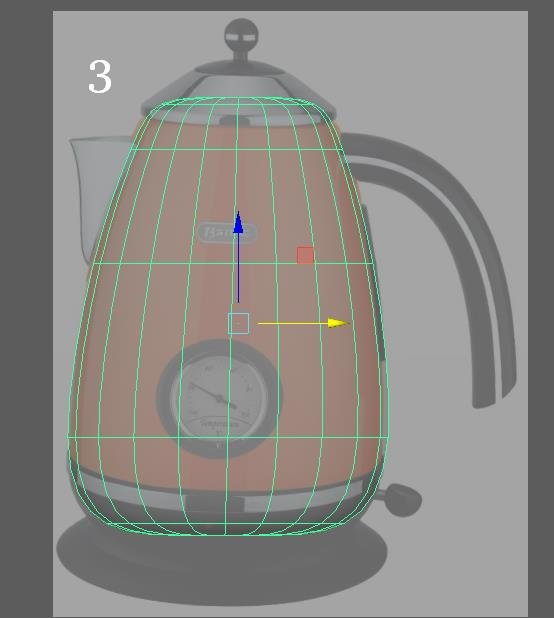 Шаг 4Используя инструмент масштабирования, придайте форму корпусу чайника. Можно заранее проверить форму объекта, как он будет выглядеть в сглаженном состоянии нажав кнопку 3. Вернуться можно через кнопку 1.