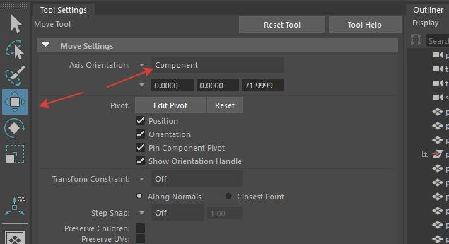 Чтобы инструмент выдавливания работал в нужном нам направлении вы можете выставить Axis Orientation как Component.