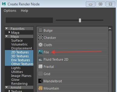 В редакторе свойств материала нажмите на черно-белый значок. Откроется окно Create Render Node. Щелкните на строке File.