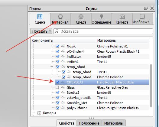 Шаг 5В разделе Сцена выберите закладку Материалы и найдите там материал, который мы назначили циферблату (надеюсь, вы это сделали самостоятельно). Щелкните по нему два раза.