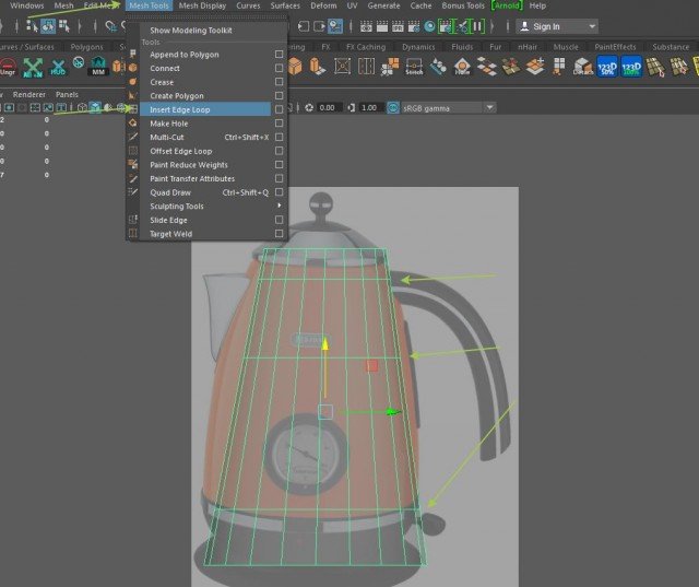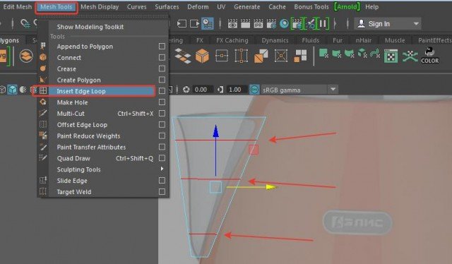 Шаг 3Манипулируя вершинами цилиндра, добейтесь результата как на картинке ниже. Также добавьте три дополнительных ребра, используя команду Insert Edge Loop из раскрывающегося меню Mesh Tools.