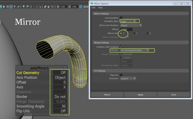 Шаг 6Поправьте вершины, чтобы получить более ровную форму. С помощью инструмента Mirror (меню Mesh> Mirror) восстановите вторую половину ручки, так она получится более симметричной. На следующем рисунке вы увидите нужные настройки инструмента. Обязательно обратите внимание на пункт Border. Иначе у вас все соединится в один непонятный кусок.