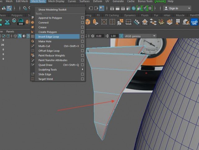 Шаг 6Защитное ребро при этом искривится. Поэтому удалите его и создайте снова с помощью команды Insert Mesh Tool, которое находиться в меню Mesh Tool.