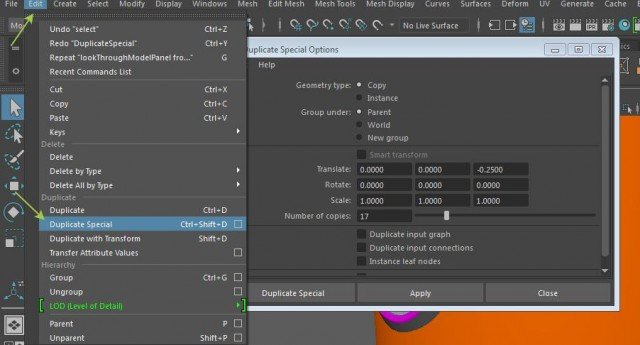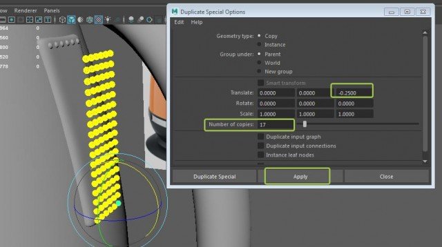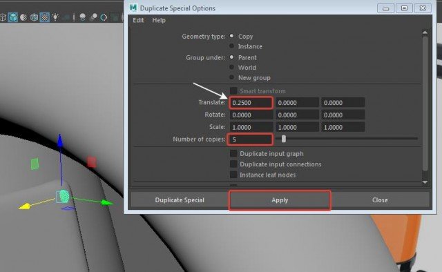 Шаг 6 Выберете опции Duplicate Special. В раскрывшемся окне выставьте значение, как показано на рисунке. Также не забудьте выставить сферу в крайнее правое положение, чуть углубив ее в основу прокладки.